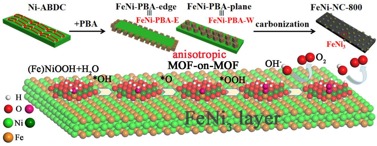 钱金杰课题组通过调控溶剂的极性制备出新颖的MOF-on-MOF异质结构(FeNi-PBA)。此项工作以条状的Ni-ABDC为前驱体,在不同极性溶剂中加入铁氰化钾和Ni-ABDC。对于极性较高的溶剂(水和甲醇),PBA优先生长在Ni-ABDC前驱体的表面上;而对于极性较低的溶剂(乙醇和正丙醇),PBA将选择性地生长在Ni-ABDC的侧面,从而得到了两种类型的MOF-on-MOF异质结构(FeNi-PBA-plane和FeNi-PBA-edge)。经过高温碳化得到一系列MOF-on-MOF衍生碳纳米复合材料,并应用于析氧反应(OER)中。在电流密度达10 mA cm-2时,优化后的FeNi-NC-800催化剂表现出最低的过电位(281 mV)和最小的塔菲尔斜率(82 mV dec-1)。这种双金属-碳复合材料显示出比对照材料更好的OER活性和稳定性,可归因于其丰富的FeNi纳米颗粒、高氮含量、大比表面积以及FeNi原子之间的协同作用。此外,在确定OER过程中的活性组分为Ni基氢氧化物(NiOOH)后,相关的理论计算也进一步证明,在NiOOH中掺入Fe元素能够有效地提升材料的电催化OER性能。
