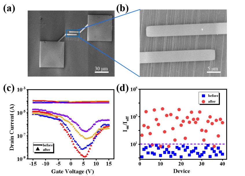图3.光氯化对SWNT阵列。(a,b) SWNT阵列FET器件的SEM图像。(c) 4个基于SWNT阵列的FET器件在Vds=1v光氯化前后的典型Ids-Vg曲线(同一颜色对应同一器件)。(d) 40个SWNT阵列FET器件在氯化前后离子Ion/Ioff比值的统计结果。