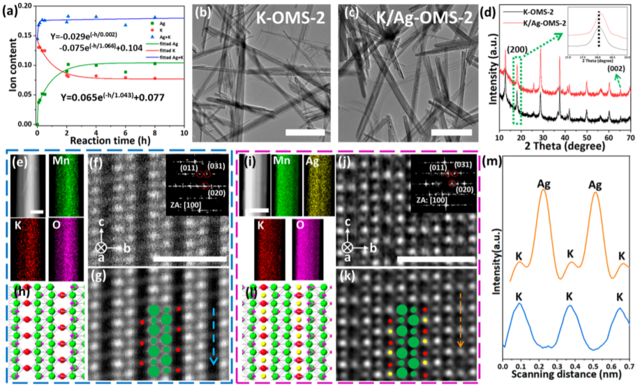 1.随着Ag+离子交换时间的增加,K-OMS-2中的Ag+含量逐渐增加,而K+含量逐渐降低,证实了Ag+−K+阳离子直接交换机制的存在。此外,还有另一种具有Ag+在不排出K+的情况下进入K-OMS-2隧道的机制,这可能导致Mn价态的降低。这一机制的发现不仅有助于基本理解OMSs隧道内的间离子反应,而且还指出了通过简单的组成控制可能调节Mn价态和OMSs的电子结构。