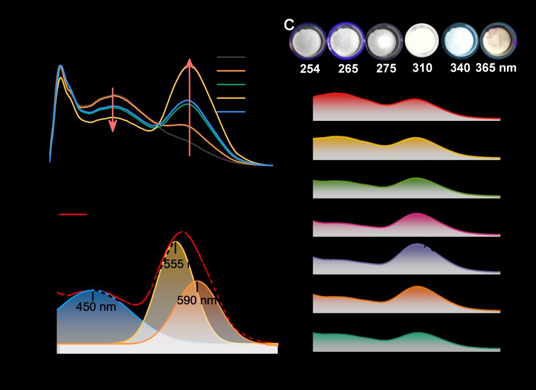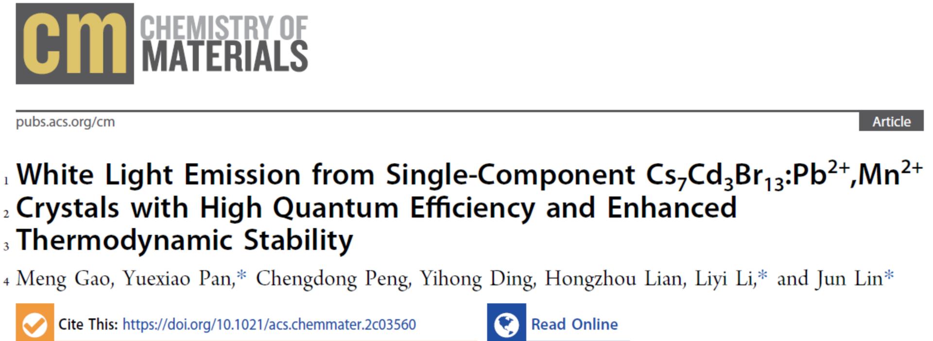 潘跃晓课题组在国际著名刊物《Chemistry of Materials》上发表题为“White Light Emission from Single-component Cs7Cd3Br13:Pb2+,Mn2+ Crystals with High Quantum Efficiency and Enhanced Thermodynamic Stability”的论文,提出一种Pb2+/Mn2+共掺杂策略,在双格位晶体Cs7Cd3Br13中实现量子产率(PLQY)高达98%的双带可调谐白光发射。通过变温光谱、寿命衰减曲线等手段提供可靠证据证明其发光源自基质的STE1、Pb2+离子诱导的自由激子(FE)和STE2、Mn2+离子d-d跃迁的发射。通过理论计算与实验结果证实了Pb2+和Mn2+在双格位晶体Cs7Cd3Br13中优先占据孤立的[CdBr4]2-四面体而不是[CdBr6]4-八面体。这一发现为在单组分中产生多个发光中心获得单组分白光提供了一个新的视角,有助于阐明同一晶体中,掺杂剂在不结构单元的优先占位机制。
