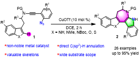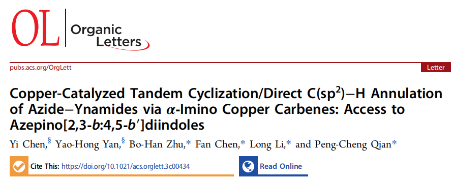 近日,我院钱鹏程-李龙博士课题组通过α-亚胺基铜卡宾的策略,开发了一种新的铜催化苯基叠氮炔酰胺的串联环化/直接C(sp2)-H环化,这种廉价金属催化的环化反应具有良好的产率和、优异的化学选择性,和 底物普适性等优点。