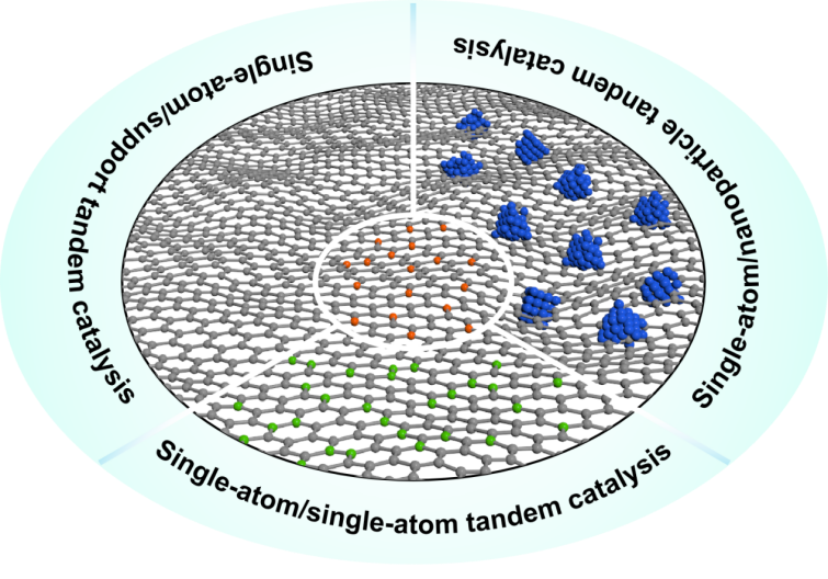 图1. 单原子/单原子、单原子/纳米颗粒和单原子/载体多功能催化剂示意图。