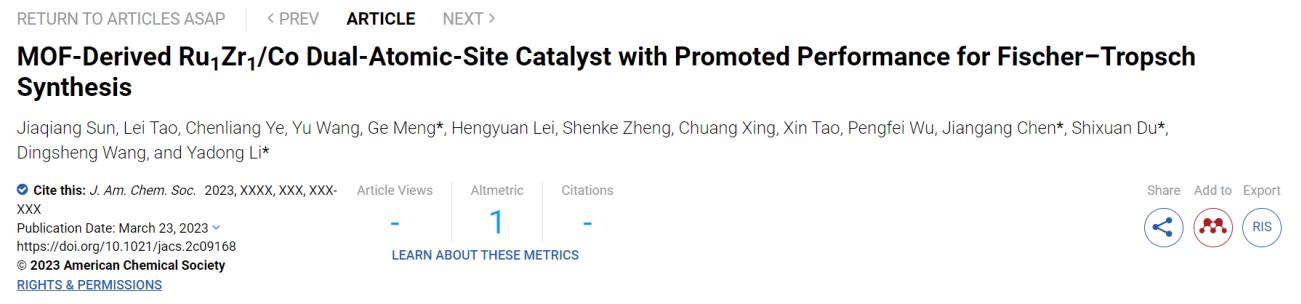 孟格博士课题组与山西煤化所陈建刚教授、中国科学院大学杜世萱教授以及清华大学李亚栋院士课题组合作合成了Ru1Zr1/Co DASC,该催化剂在200℃下表现出3.8×10-2 s-1的高翻转频率(TOF)和80.7%的C5+选择性,这远高于Co、Zr1/Co和Ru1/Co对应的值。密度泛函理论(DFT)计算表明Ru/Zr原子在Co NPs上的界面可以协同作用促进链生长,降低C-O断裂势垒。该工作为高性能费托合成和其他工业催化过程的DASC设计提供了新的机会。这一成果近期发表在Journal of the American Chemical Society (DOI: 10.1021/jacs.2c09168)。我院孟格博士为通讯作者之一。