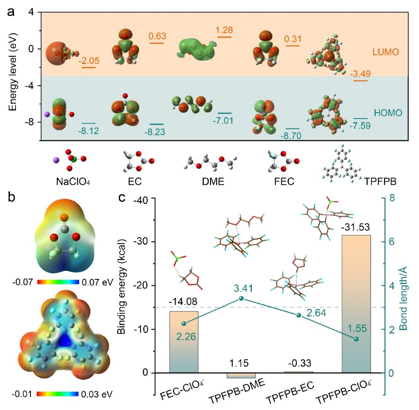 图1. (a)电解液各组分的HOMO/LUMO能级;(b)添加剂FEC和TPFPB的静电势密度分布图;(c)键长及结合能数据