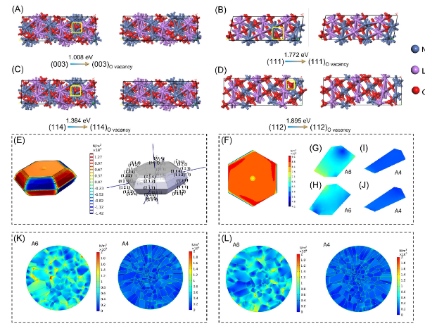 碳中和研究院肖遥团队通过氢氧化物共沉淀法结合固相高温烧结调控出了具有暴露不同比例(003)晶面方向的LiNi0.92Co0.04Mn0.04O2正极材料。实验表征与有限元分析并结合理论计算从颗粒的宏观形貌到晶面层面证明了沿(003)晶面方向暴露较多的颗粒宏观上在充放电过程中晶间与晶内应力累积较大,微观上(003)晶面晶格失配度较大,且晶面应力分布呈涡流状。此外,(003)晶面氧空位形成能较小易失氧,导致晶间与晶内裂纹,及晶体结构退化。该工作为层状氧化物材料的晶面结构设计提供了理论基础。