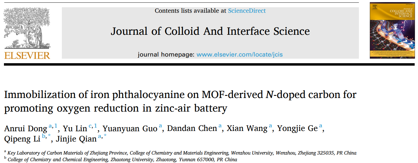 这项研究的成果题为《Immobilization of iron phthalocyanine on MOF-derived N-doped carbon for promoting oxygen reduction in zinc-air battery》,发表在《Journal of Colloid and Interface Science》(中科院1区,Top,IF=9.965)上。日本a片