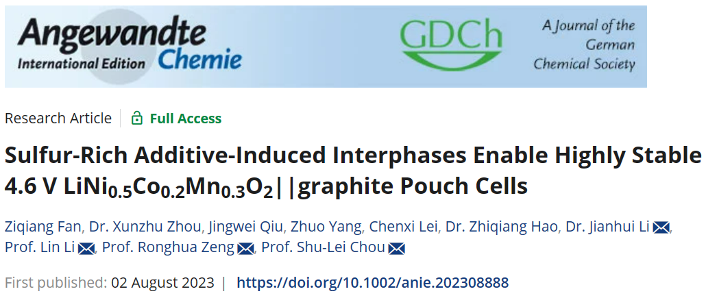 近日我院碳中和技术创新研究院李林团队联合华南师范大学曾荣华教授、李键辉博士在国际权威期刊Angewandte Chemie International Edition上发表题为《Sulfur-Rich Additive-Induced Interphases Enable Highly Stable 4.6 V LiNi0.5Co0.2Mn0.3O2||graphite Pouch Cells》的学术论文。本论文通过在4.6 V LiNi0.5Co0.2Mn0.3O2(NCM523)||石墨软包电池中引入含硫量为34.04%的超高含硫量添加剂(甲烷二磺酸亚甲酯,MMDS),从而构建了一种由添加剂诱导形成的稳固富硫电极-电解液面相。在4.6 V高电压条件下,循环800次,含MMDS添加剂的NCM523||石墨软包电池仍具有87.99%的高容量保持率以及更好的倍率性能,且与较低硫含量的一系列添加剂做对比,突出了高含硫量添加剂MMDS的优势。结合实验表征以及理论计算,进一步探究了MMDS添加剂在溶剂中的优先氧化还原性,从而证明它能够优先在正负极上界面构筑稳定的富硫电极-电解液界面膜,该界面相的存在成功稳定了高电压NCM523||石墨软包电池,显著提高了电池的循环稳定性。同时实验结果也表明MMDS分解所构筑的富硫界面相在抑制电解液消耗、产气以及稳定电极材料、减少过渡金属溶出上有着非常好的效果。日本a片相关的文章发表在Angewandte Chemie International Edition上,日本a片