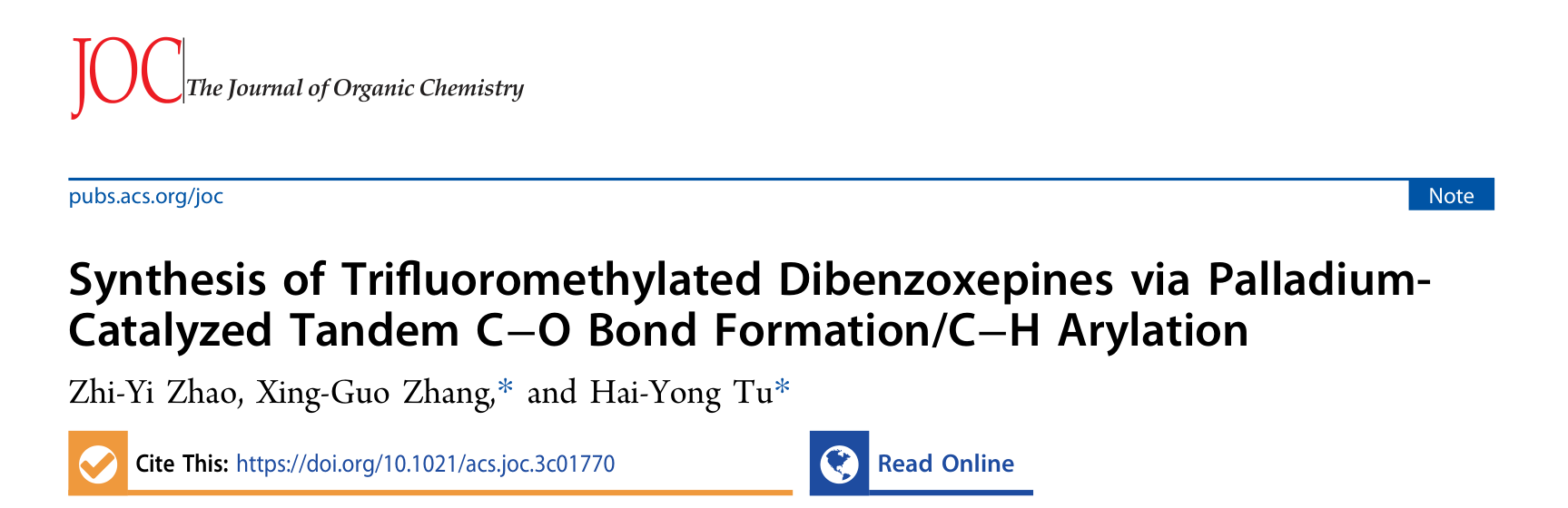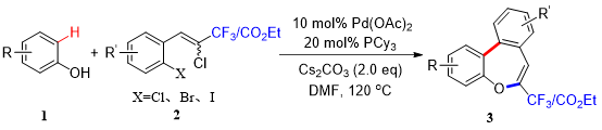 最近,我院张兴国教授、涂海勇副教授、硕士生赵治义发展了一种钯催化串联C-O键形成和C-H芳基化反应,为合成6-三氟甲基二苯并[b,d]氧杂䓬提供了一种简便高效的方案。相关成果以标题 “Synthesis of Trifluoromethylated Dibenzoxepines via Palladium Catalyzed Tandem C-O Bond Formation/C-H Arylation ” (DOI: org/10.1021/acs.joc.3c01770 ) 发表在The Journal of Organic Chemistry 上。在该工作中,作者以不同取代基的苯酚与2-氯-1-(邻卤代芳基)-3,3,3-三氟丙烯进行反应,得到了一系列的三氟甲基取代的二苯并氧杂䓬。作者以苯酚与1-溴-2-(2-氯-3,3,3-三氟丙-1-烯-1-基)苯为模板底物对反应条件进行了筛选。最终确定最优条件为:醋酸钯为催化剂,三环己基膦为配体,碳酸铯为碱,超干溶剂N,N-二甲基甲酰胺为溶剂,在氮气氛围中120oC反应24小时,产率达74%。