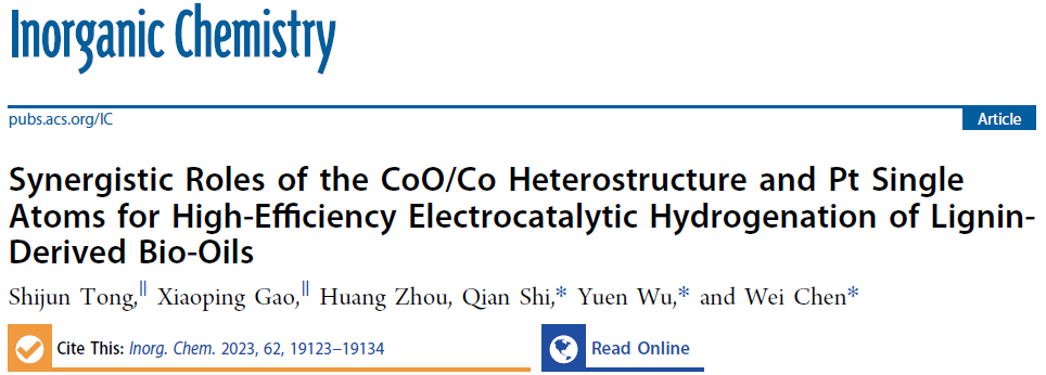 我院陈伟、时茜教授课题组和中国科学技术大学吴宇恩教授课题组在国际期刊《Inorganic chemistry》发表题为“Synergistic Roles of the CoO/Co Heterostructure and Pt Single Atoms for High-Efficiency Electrocatalytic Hydrogenation of Lignin-Derived Bio-Oils”的论文。该工作通过简单的电化学沉积的方法在CoO/Co异质结构上引入Pt单原子,通过单原子与载体之间独特的协同作用,优化了反应物、中间体和产物在催化活性中心上的吸附行为,从而显示出对苯酚ECH的高催化活性。一方面,由于自由电子从相邻的Co金属转移到Pt单原子位点附近,质子被还原并吸附在单原子Pt位点。另一方面,苯酚以平行构型吸附活化在CoO上。然后,单原子Pt周围的金属Co原子起到了关键的“桥梁”作用,将活化的H物种通过氢溢流转移到吸附的苯酚物种,最终生成KA油。