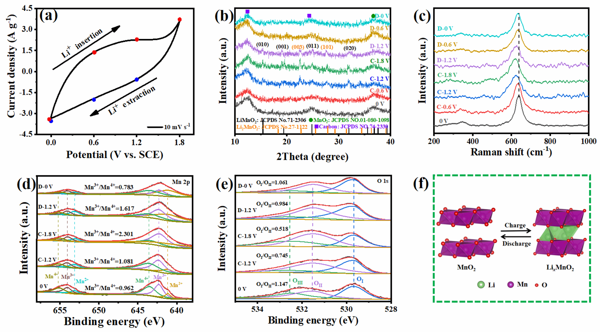3. 在21 M LiTFSI“盐包水”电解液的三电极体系中,发现MnO2/MBC超级电容器材料在快速充放电过程中存在可逆的嵌锂/脱锂反应MnO2+xLi++xe-↔LixMnO2。具体体现在充电过程中一定量的Li+插入MnO2隧道中生成LixMnO2,该过程中发生的Jahn-Teller畸变以及晶格氧空位到表面氧空位的相变,不仅会为表面吸附的氧(Mn-OH等)产生更多的吸附/键合位点,使其比晶格氧对内部MnO2具有更高的离子迁移率,而且还有助于电极内的电子转移能力,从而显著提高该电极的表面电化学活性。当电极放电至0 V时Li+从LixMnO2中脱出恢复成MnO2。因此,MnO2/MBC//AC不对称超级电容器在21 M LiTFSI“盐包水”电解液中其实就是一个锂离子混合电容器。