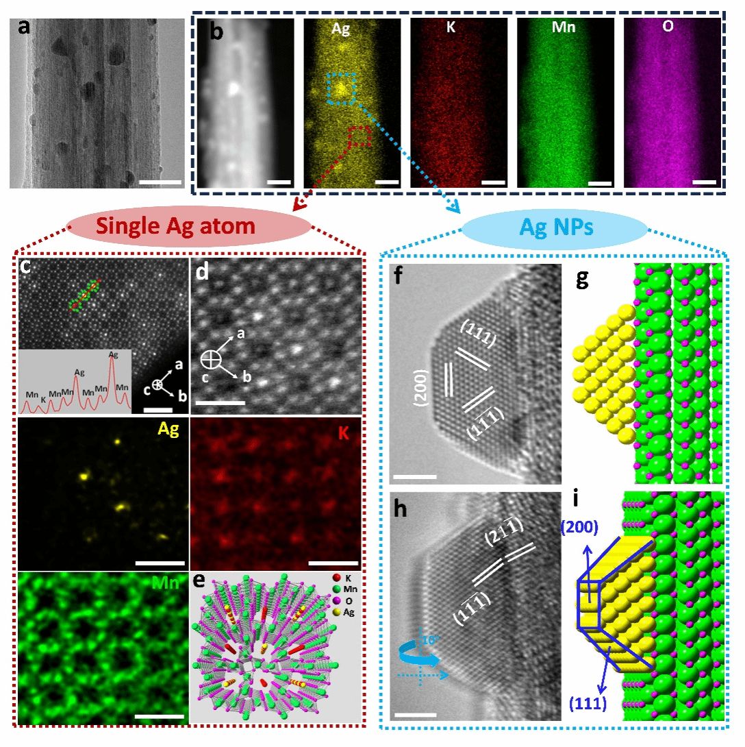 王舜/袁一斐/吕晶晶教授课题组在国际顶级期刊《Advanced Materials》发表题为“Seeding Atomic Silver into Internal Lattice Sites of Transition Metal Oxide for Advanced Electrocatalysis”的论文。该工作利用隧道结构的α-MnO2作为基底,将Ag原子链引入α-MnO2隧道内部,并且在MnO2表面通过共享晶格外延生长负载了Ag纳米颗粒,从而制备了双位点Ag催化剂。通过开发过渡金属氧化物晶格内部的催化剂负载位点,可以大大增加基底的催化活性中心,提高电催化二氧化碳还原的效率,并且隧道内部的催化剂由于金属离子-基底间的协同作用,导致其中间反应过程中的能垒显著降低。更重要的是,MnO2对内外的Ag催化剂物种均具有很强的约束作用,可以抑制Ag的团聚,从而提高催化剂的循环寿命。