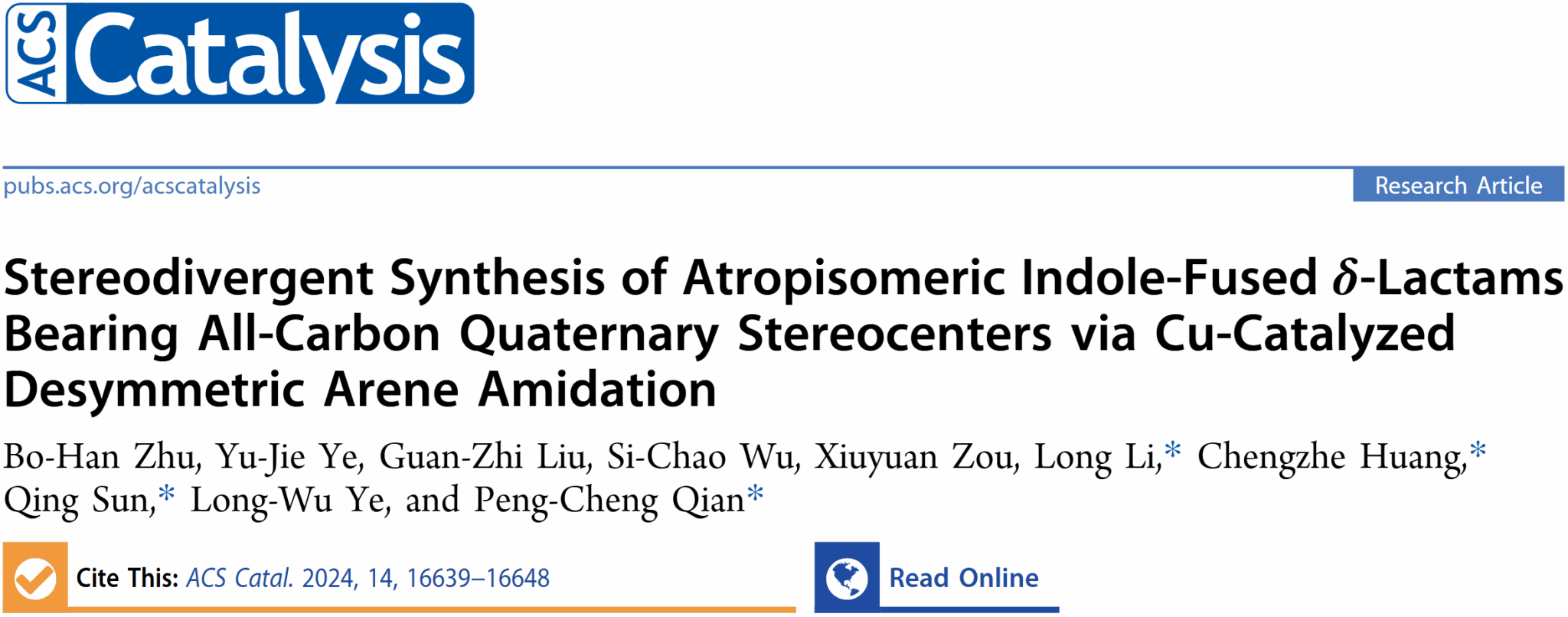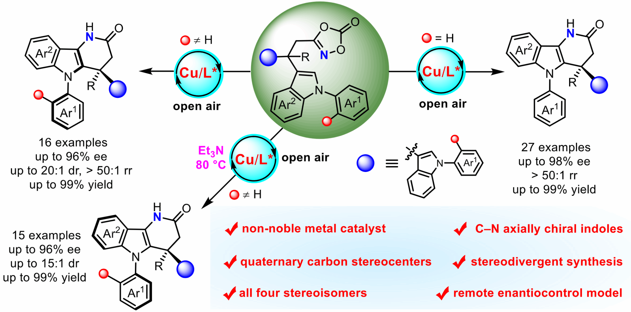 鉴于此,我院钱鹏程-李龙教授课题组开发了一类铜催化的酰基氮宾迁移不对称芳烃δ-内酰胺化反应,构建了具有全碳立体中心和 C-N 轴手性的吲哚并δ-内酰胺化合物,具有良好的产率、立体选择性和区域选择性,底物范围广。通过手性配体与有机碱的结合使用,即可轻松实现包含全碳立体中心和 C-N 轴手性的δ-内酰胺所有四种立体异构体的合成。此外,该反应可能经历了铜催化的单线态氮转移/重排和远程对映体控制过程,得到了控制实验和理论计算的大力支持。