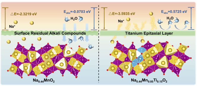 基于此,我院碳中和研究院肖遥团队提出了一种通过Ti取代Mn的内外协同策略,降低材料表面残碱、调节电化学行为,并进一步提高Na0.44MnO2耐水性。通过钛取代的材料不仅在传统的PVDF/NMP体系中表现出优异的循环稳定性,同时在CMC/H2O体系中也表现出优异的倍率性能和超高的循环稳定性。利用原位XRD、深度刻蚀XPS表征技术,证明了钛取代的样品在充电和放电过程中具有优异的结构稳定性及表面存在含Ti外延层。DFT理论计算阐明了电子结构的机制,同时进一步证明了钛取代的正极材料具备优异的疏水性。同时,本工作采用工业级原料进行了大规模Na0.44Mn0.85Ti0.15O2材料的制备,与实验室小批量的Na0.44Mn0.85Ti0.15O2电化学性能相比,仍表现出优异的倍率性能和循环稳定性。此外,本文提出了一种基于富钠材料PBA的新型钠补偿策略。制备出的PBA-Na0.44Mn0.85Ti0.15O2复合材料用作正极,与硬碳负极组装成钠离子电池,首次实现了隧道型氧化物正极从实验室放大到工业生产,为隧道型氧化物正极在SIBs中的实际应用提供了重要参考。