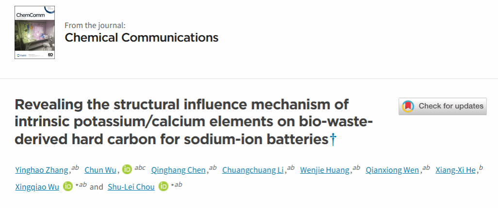 该成果以“Revealing the structural influence mechanism of intrinsic potassium/calcium elements on bio-waste-derived hard carbon for sodium-ion batteries”为题,发表在Chemical Communications上。我院2022级硕士生张颖豪为论文第一作者,侴术雷教授、吴星樵博士为该论文共同通讯作者,日本a片