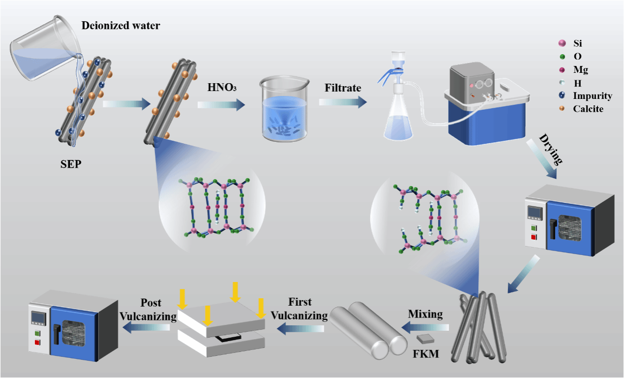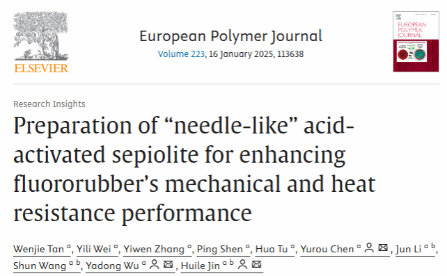 该成果以“Preparation of “needle-like” acid-activated sepiolite for enhancing fluororubber’s mechanical and heat resistance performance”为题发表在European Polymer Journal期刊(IF=5.8,SCI二区)上,日本a片