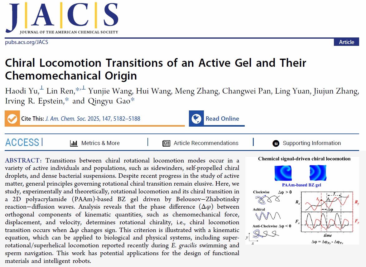 化材学院任林教授与中国矿业大学高庆宇教授和美国布兰迪斯大学I.R. Epstein教授紧密合作取得活性运动研究领域重要进展,相关成果以"Chiral Locomotion Transitions of an Active Gel and Their Chemomechanical Origin"为题发表于化学领域顶级期刊Journal of the American Chemical Society。日本a片