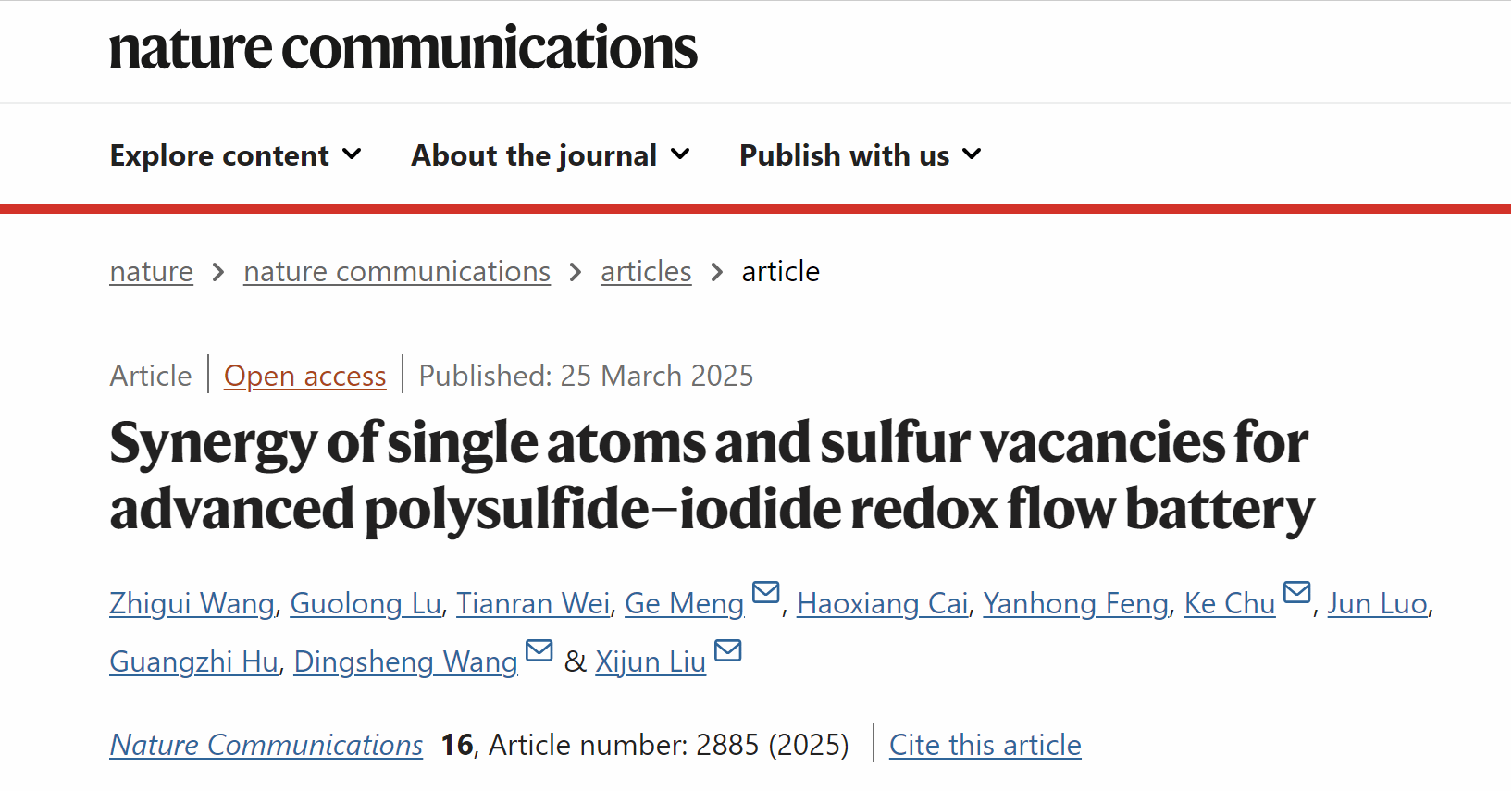 该成果以“Synergy of single atoms and sulfur vacancies for advanced polysulfide–iodide redox flow battery”为题,于2025年3月25日在线发表于国际顶级期刊《Nature Communications》(DOI: 10.1038/s41467-025-58273-9)。日本a片