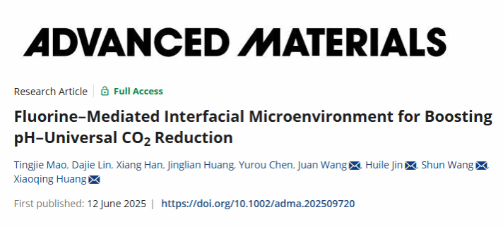 化材学院校王舜/金辉乐/王娟团队以及厦门大学黄小青教授在国际顶级期刊《Advanced Materials》发表题为“Fluorine–Mediated Interfacial Microenvironment for Boosting pH–Universal CO2 Reduction.”的学术论文。在这项工作中,使用缺陷辅助策略成功的将镍物种(单原子和原子簇)锚定在氟碳基材(FC)上,通过构建单原子耦合原子团簇策略制备得到了高效稳定的CO2RR电催化剂,优化后的Ni/FC在酸性、中性和碱性电解质中表现出优异的FECO,分别为92.0%、99.1%和98.8%。相反,当F元素不存在时,HER过程占主导地位。更重要的是,Ni/FC可以在宽pH范围内保持优异的FECO。值得注意,在工业电流密度(200 mA cm-2)下能稳定运行3000小时,明显优于最近在不同电解质条件下报道的电催化剂。结合密度泛函理论(DFT)计算、原位红外光谱(ATR-FTIR)以及原位增强拉曼测试表征全面揭示了引入F后FECO增强和FEH2抑制的内在原因:F的高电负性将导致正Cδ+中心的形成,这会抑制氢的吸附,提高界面水的离解能垒,从而抑制竞争性HER过程(即正电碳Cδ+中心能够 “隔离”质子,抑制HER)。同时,气-固-液界面处产生的局部微环境有利于降低速率决定步骤(RDS)的能量势垒,从而促进CO2转化为CO。