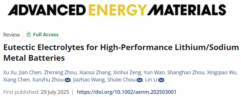 近日,我院侴术雷教授、李林特聘教授课题组在国际权威期刊Advanced Energy Materials发表题为“Eutectic Electrolytes for High-Performance Lithium/Sodium Metal Batteries”的综述文章。该综述聚焦近年来在共晶电解液领域的研究进展,系统梳理了其在锂/钠金属电池中的应用潜力与关键挑战。本文从共晶电解液的形成机制出发,详细探讨其物理化学特性并系统总结了其在提升循环稳定性、快充能力、高电压兼容性与温度适应性等方面的进展,并展望了未来的研究方向。该综述为高性能锂/钠金属电池电解液系统的分子设计与界面调控提供了重要参考。日本a片相关的文章发表在Advanced Energy Materials上,日本a片
