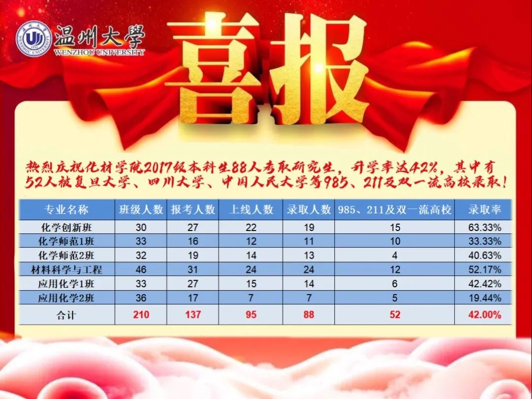 2021届学生考研工作再创佳绩。学院2021届毕业生共210人,137人报考研究生考试,95人过国家复试线,过线人数达到报考人数的69%;其中88人成功被录取,录取人数达到报考人数的64%,升学人数占全体本科毕业生数的42%;有52人被复旦大学、四川大学、中国人民大学等985、211及双一流高校录取,考研录取率和考取名校人数创历史新高,这一切离不开学院良好的学风、院风。