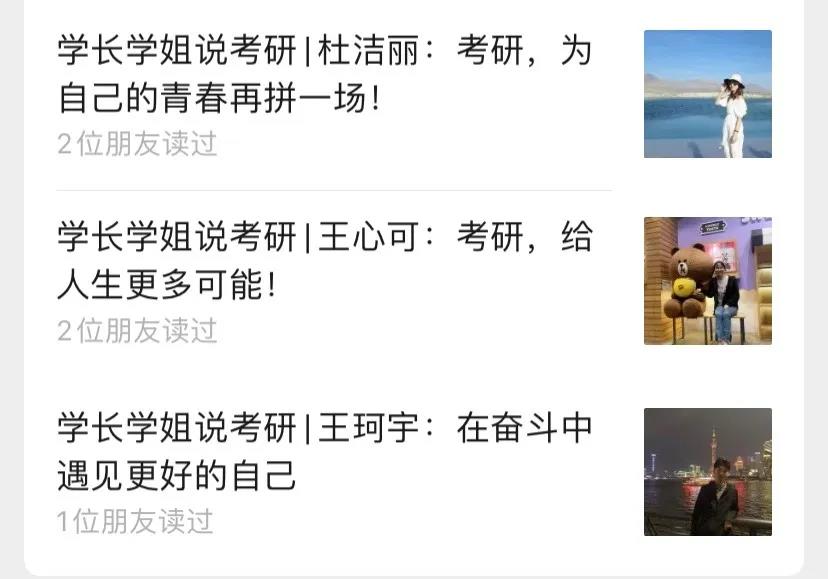在学院公众号推发考研相关内容,整合考研相关信息,分享考研成功的学长学姐的考研经历和读研生活,鼓励同学们考研。