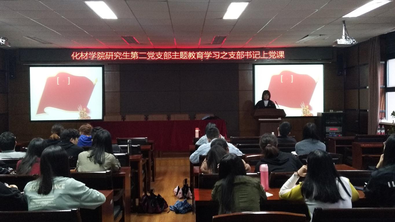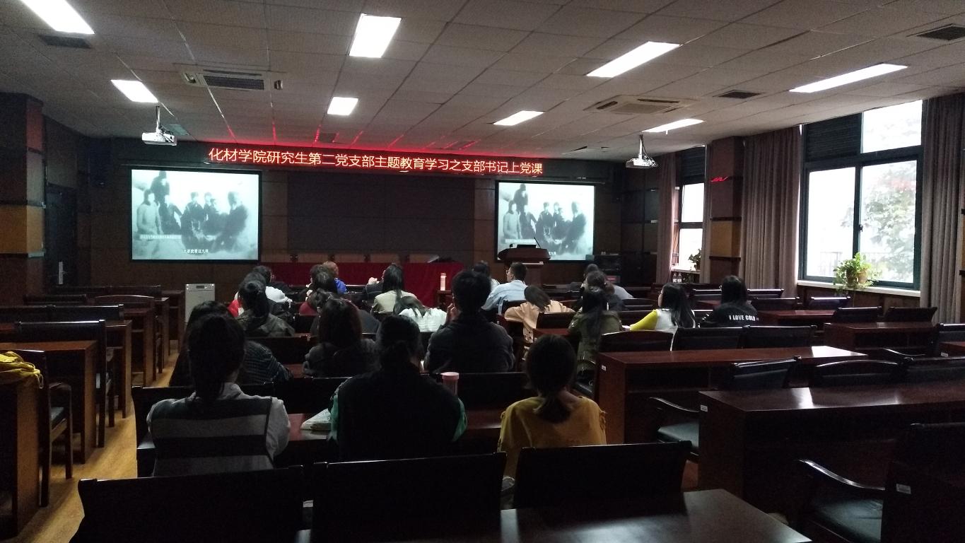 为贯彻“不忘初心、牢记使命”主题教育,增强守初心、担使命的思想和行动自觉。正逢新中国成立70周年,主题教育正当其时。按照中央统一部署和学校统一安排,我们支部全力贯彻学校安排的七个“一”任务并于10月28日,在化材学院11B208举行了支部书记上党课及主题教育集中学习活动。
