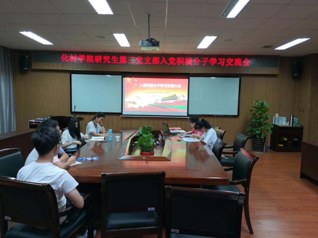2019年6月10日19:30,化材学院研究生第三党支部在化材楼11B-204召开了2018-2019学年第二学期入党积极分子学习交流大会。本次会议由支部书记贾雅君同志主持,研究生第三党支部支委及全体入党积极分子参加了本次会议。