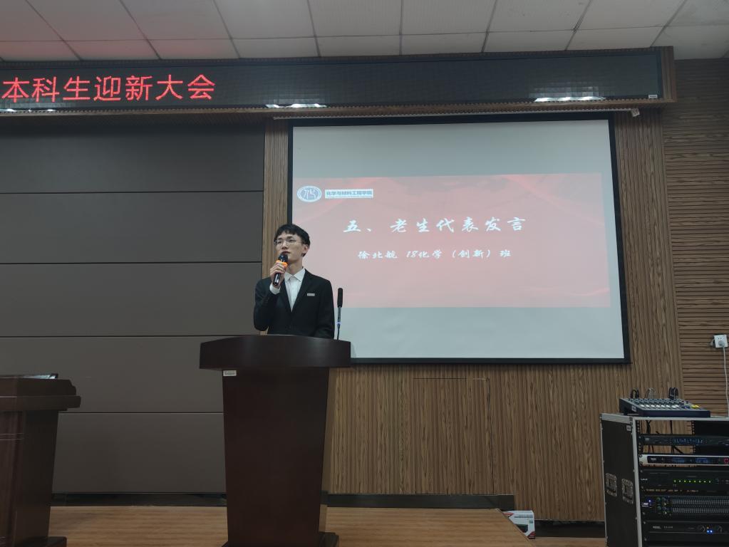 之后,由18化学创新班徐北航作为老生代表讲话,他对新生提出几点建议:明确目标;做出正确选择;与人为善,真诚待人。由20化学师范2班吴怡雯同学作为新生代表讲话,她对未来四年的大学生活表示美好的期待。