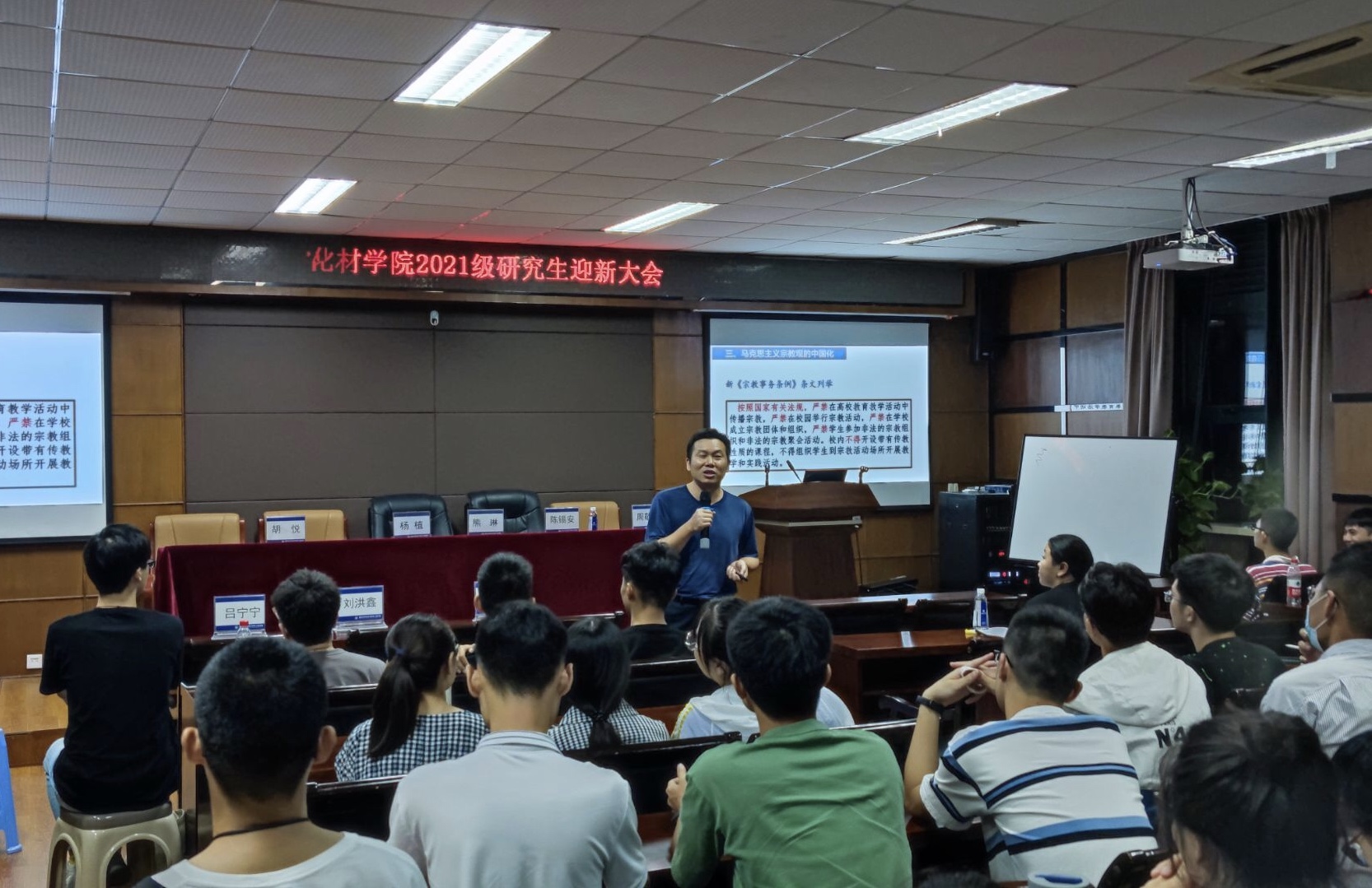 新生大讲堂最后一部分由学院副书记周敬业老师向全体新生作《马克思主义宗教观》主题报告,周老师从宗教本质、宗教根源、宗教发展等几个方面展开教育,鼓励大家正确认识宗教,在讲座过程中还对全体新生进行了宗教信仰信息摸排。