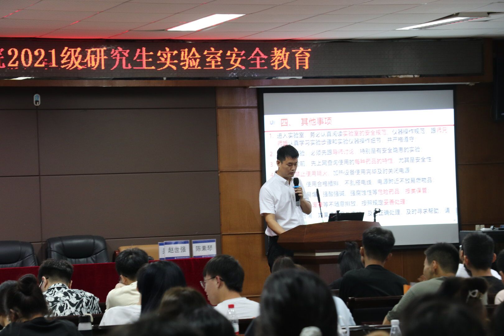 在新生大讲堂期间,由陈素琴、吴登泽、赵世强等三位老师主持,三位老师就以下几个方面对新生就培养实验安全意识方面进行教育。