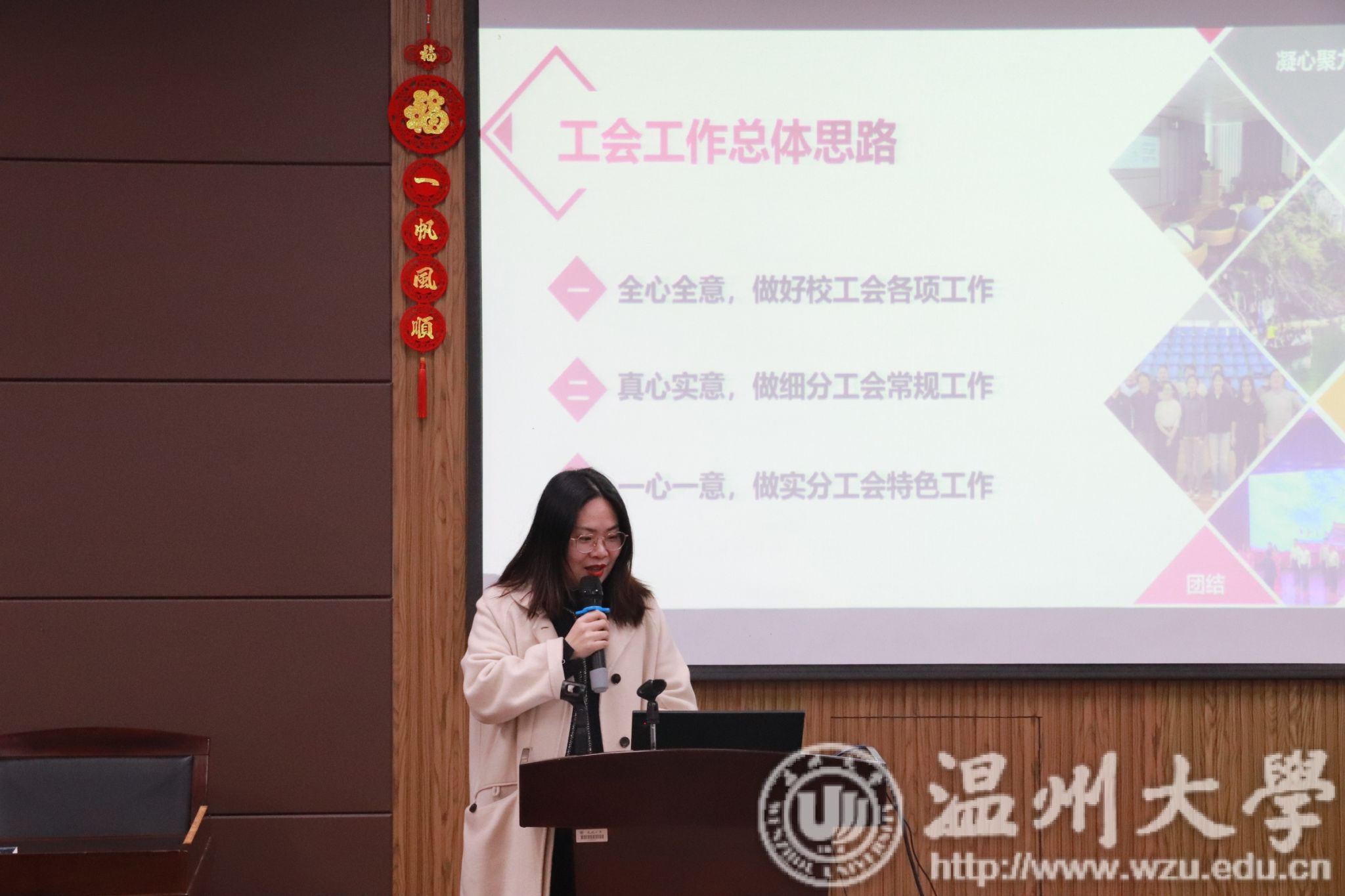 工会主席刘楠楠作学院工会工作报告,她从全心全意做好校工会各项工作、真心实意做细分工会常规工作、一心一意做实分工会特色工作等几个方面对过去一年工会工作进行了回顾与总结。