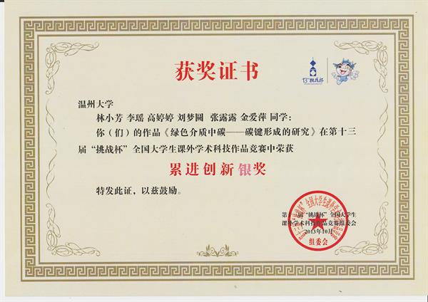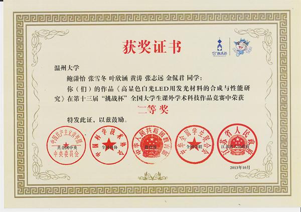 在刚刚闭幕的第十三届“挑战杯”全国大学生课外学术科技作品竞赛决赛中,潘跃晓、王稼国老师指导的《高显色白光LED用发光材料的合成与性能研究》获全国二等奖以及邵黎雄、陆建梅老师指导的《绿色介质中钯催化碳-碳键构建的研究》获累进创新银奖,特向指导教师和参赛选手表示热烈祝贺!