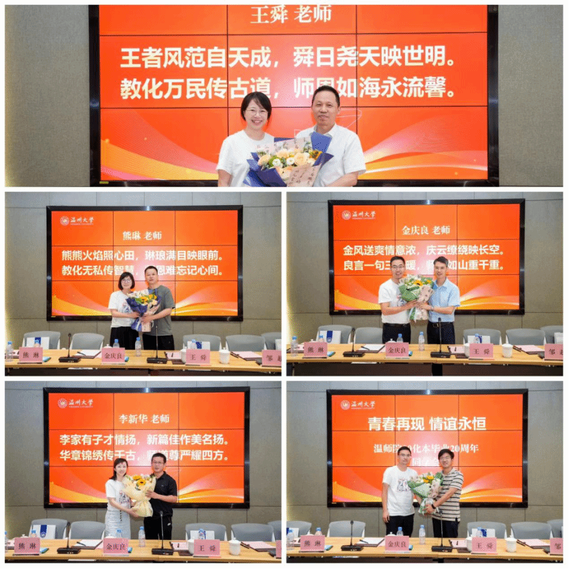 校友们依次发言,真挚地分享了自毕业以来的心路历程与成长故事,重温了那段深厚的同窗情谊,并对母校的悉心培养表达了由衷的感激。与会的班主任和辅导员老师们也满怀深情地回顾了与同学们一起经历的梦想追寻、奋斗拼搏和成长岁月,言辞中满溢着骄傲与自豪。大家在回顾往昔中增进了师生情,在交流碰撞新思想中开拓新路径、打开新格局。习近平总书记强调“无论走得多远,都不要忘记来时的路。”时隔二十年,同学们的所学专业相同但所做的选择不同,尽管所处的岗位有别,但是大家都谨记开启理想大门的起点,一致认同“求学问是,敢为人先”的温大校训点亮了人生路,化材优秀的教风学风奠定了成就未来的基石。