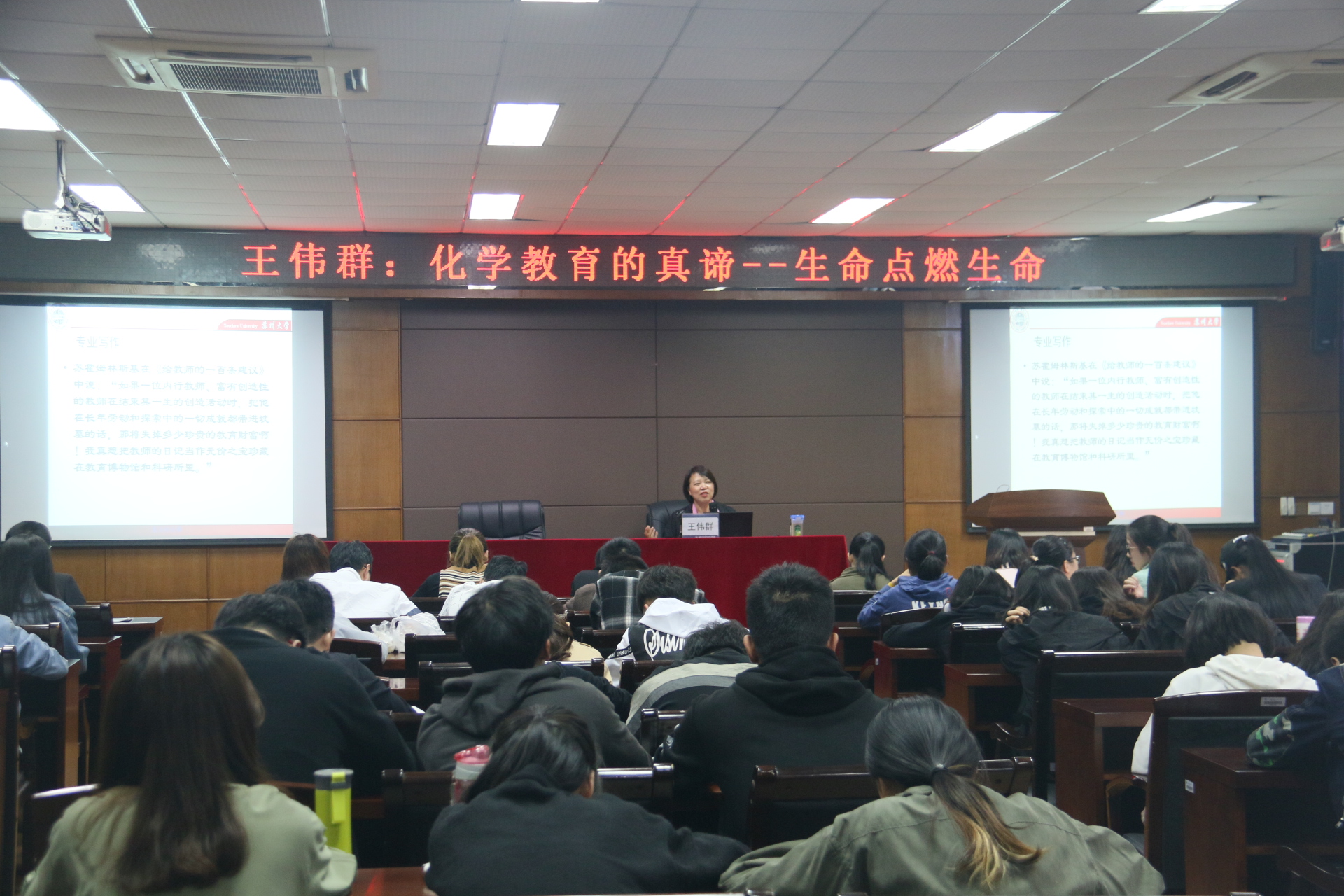 在化材楼11B-208会议室举办了第80期“责任·成长·成才”讲堂。我院82级校友、苏州大学材料与化学化工学部的王伟群教授给我院师范生带来了“化学教育的真谛——生命点燃生命”为主题的校友分享会。